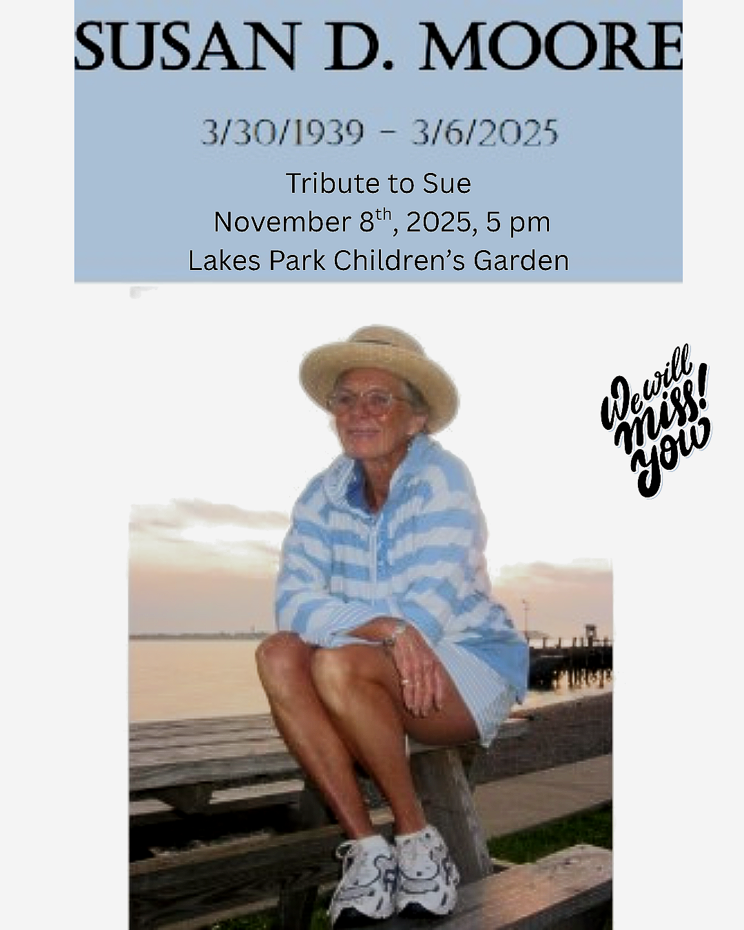 Please join us at 5 pm on Saturday, November 8th, at Lakes Park in the Children’s Garden to pay tribute to Sue Moore. We will be unveiling a plaque and our new mural dedicated to